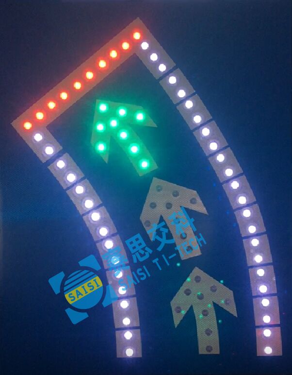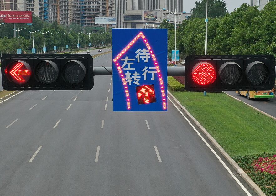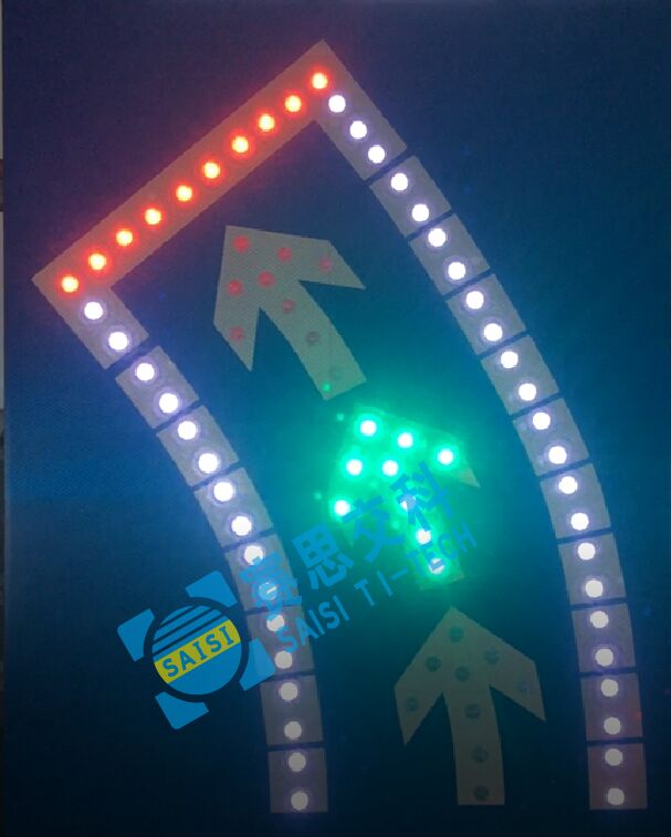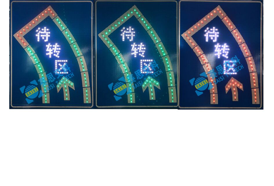 2、工藝說明:標(biāo)志版面由LED發(fā)光管組成停車線、邊緣線、箭頭圖形,通過控制模塊調(diào)取信號燈燈色狀態(tài),在標(biāo)志版面形成動態(tài)三種狀態(tài),動態(tài)引導(dǎo)待轉(zhuǎn)車流通行權(quán)限。