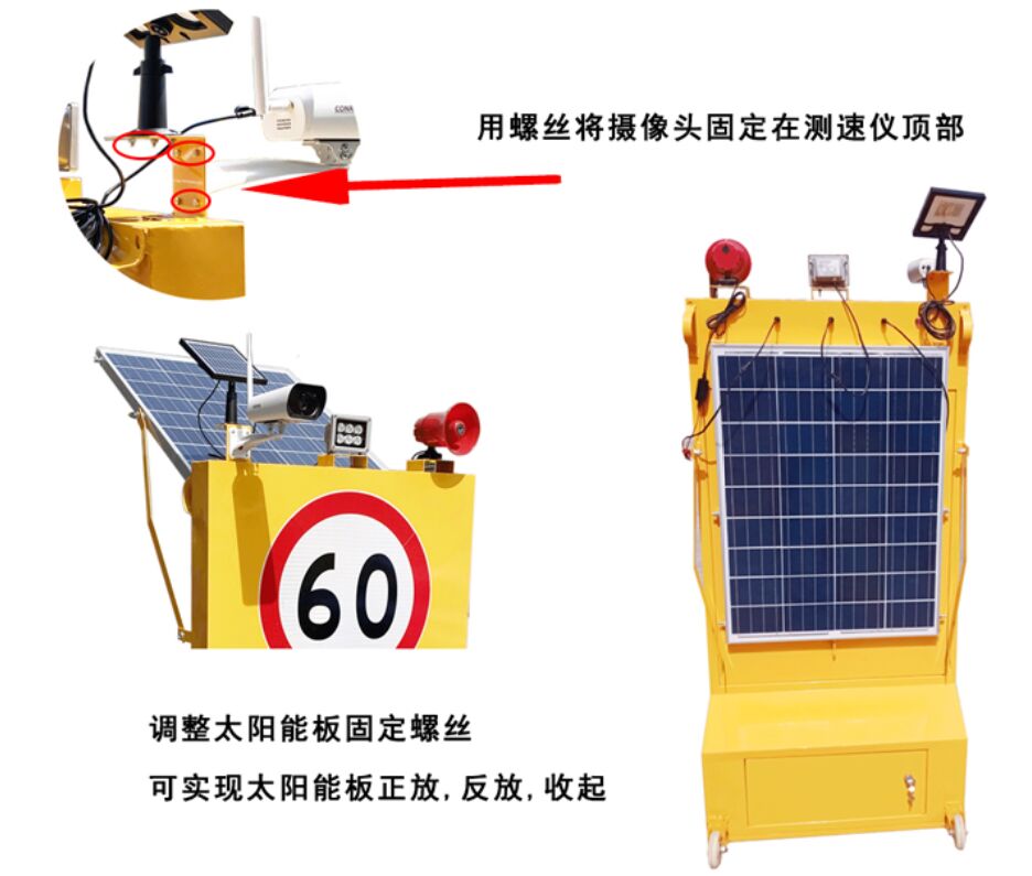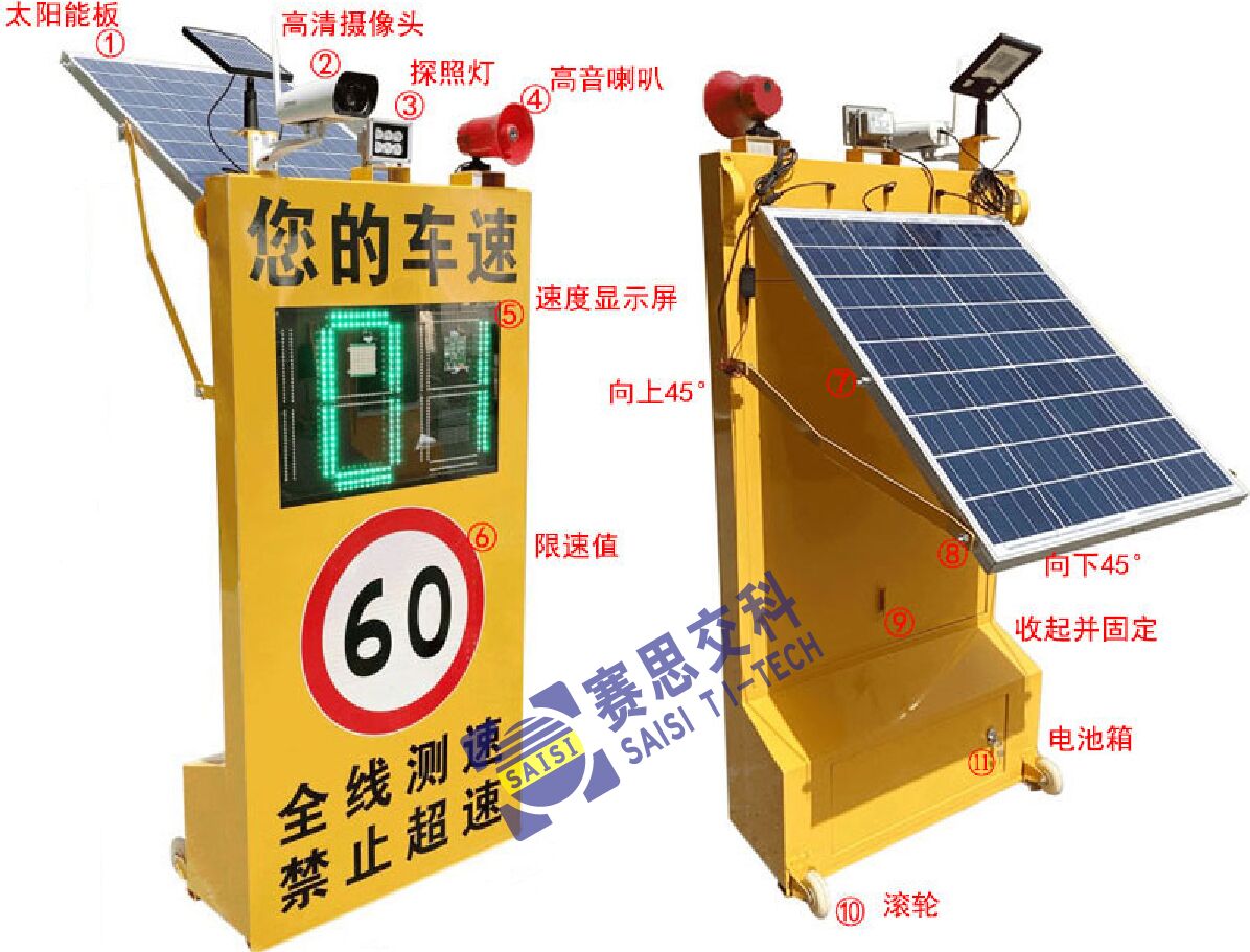1、標(biāo)志整體為立體裝置平臺(tái),主要包括:語(yǔ)音警示喇叭、速度條碼顯示屏、視頻記錄攝像頭、太陽(yáng)能蓄電池供電系統(tǒng)等設(shè)備。當(dāng)被測(cè)車(chē)輛通行車(chē)速超過(guò)限制速度時(shí),速度條碼顯示屏以紅色顯示當(dāng)前車(chē)速,并啟動(dòng)語(yǔ)音警示喇叭告知車(chē)輛以超速行駛;當(dāng)被測(cè)車(chē)輛通行車(chē)速超過(guò)限制速度時(shí),速度條碼顯示屏以綠色顯示當(dāng)前車(chē)速。攝像頭全天候記錄路段動(dòng)態(tài)視頻,夜間開(kāi)啟補(bǔ)光燈。該裝置對(duì)車(chē)輛超速行駛行為有較高的警示效果、特別適用于事故易發(fā)路段、團(tuán)霧頻發(fā)路段、需加強(qiáng)管理路段。