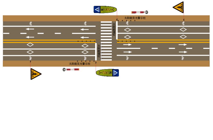 當一邊的激光雷達監測設備在人行橫道線兩端監測到有行人時,向兩側的注意行人發光警告標志、語音播報系統發送無線控制信號,同時點亮發光標志和語音播報系統,告知路段機動車駕駛人前方有行人過街,注意禮讓行人。系統根據道路寬度,計算行人過街的通用時間,采用延時計算方法,當超過延時長度時,監測系統未監測到新的人行過街信號時,自動關閉發光警示標志和語音播報器,只到新的行人過街信號出現。總平面圖如下: