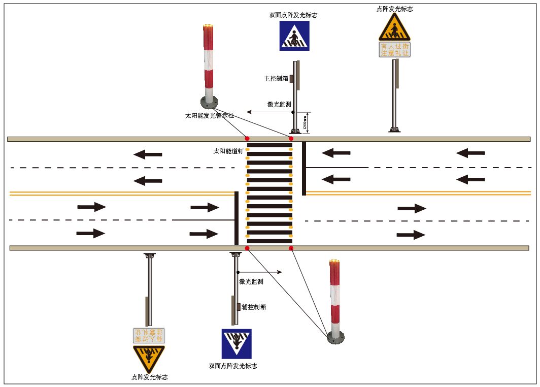 本智能行人過街預警系統,主要包括:激光雷達監測設備、人行橫道發光指示標志(雙面)、注意行人發光警告標志(輔標"有人過街、注意禮讓")、語音播報器、太陽能發光警示柱、太陽能發光道釘、無線數據傳輸模塊、總控制系統(含軟件)等。