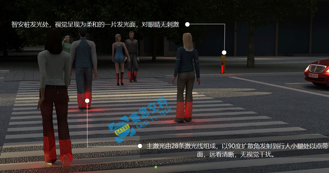經(jīng)權(quán)威檢測,智安樁的激光燈功率僅為舞臺燈的1/10。通過激光燈組以點(diǎn)帶面和特制光學(xué)透鏡的配合,激光線明亮柔和,在有效警示司機(jī)的同時,避免對人眼造成傷害。此外,光線集中不擴(kuò)散、切面平整,光線保持在安全合理的位置,杜絕光線干擾和污染。