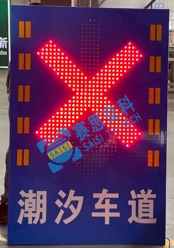 1、基本說明:標志框體內采用數碼布點,嵌入密集LED發光點陣,采用固定電路開板,顯示獨立的箭頭、紅叉LED圖案,根據交通組織需要,分時段切換。