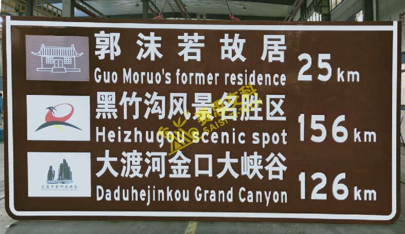 采用主動(dòng)發(fā)光工藝的旅游標(biāo)志牌,其版面通常由:風(fēng)景點(diǎn)名稱文字、預(yù)告距離、引導(dǎo)方向箭頭、風(fēng)景區(qū)圖片LOGO等組成,標(biāo)志底板采用棕色反光膜(旅游標(biāo)志專用膜)。標(biāo)志主動(dòng)發(fā)光工藝,采用內(nèi)置光源定向投射標(biāo)志面板,形成自主發(fā)光的效果。其優(yōu)點(diǎn)主要有:
