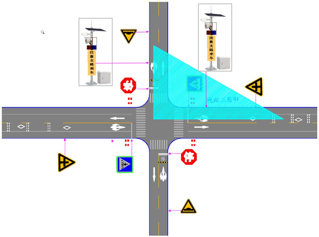 A)支線上設置減速讓行、或停車讓行標志,有條件可采用太陽能主動發光標志,或于標志上方配置太陽能爆閃警示燈。