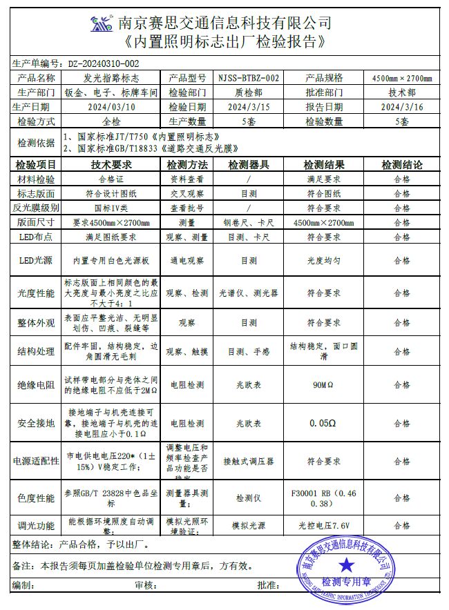 一塊完整的發光標志牌生產技術,涉及到:材料力學、結構力學、光學、電子電路、太陽能供電系統、智能控制、數據通訊等眾多領域,任何一道工序的馬虎麻痹,都會導致標志最終的質量瑕疵,“將問題控制在出廠前!”這是我們賽思交科提出的生產管理口號,出廠前發現問題,能及時補救,設備資源、人力資源、技術資源都很完備,遠勝于出廠后才發現問題的茫然與手忙腳亂。“讓客戶放心、省心、安心!”這是我們賽思交科的服務宗旨,出廠前,對每一個細節的注重,就能省去客戶現場的很大麻煩。“我們比客戶更專業!我們比客戶更懂發光標志!我們比客戶更了解發光標志的內部結構!我們比客戶更具備解決問題的各種條件資源!”,消患于未然,我們賽思交科作為良心企業,必須要高度重視檢查檢測工作?。〕鰪S前,我們嚴格按照《檢查檢測作業指導流程》,做好以下檢查檢測工序: