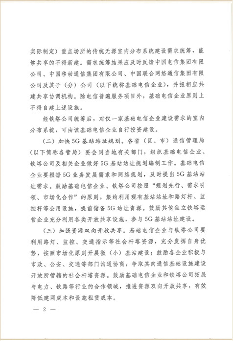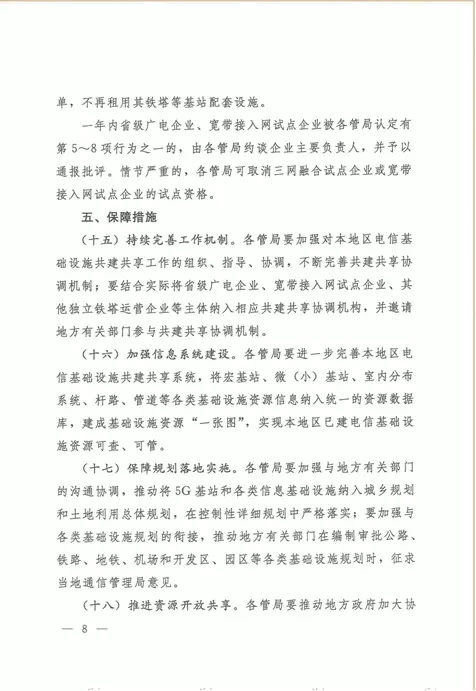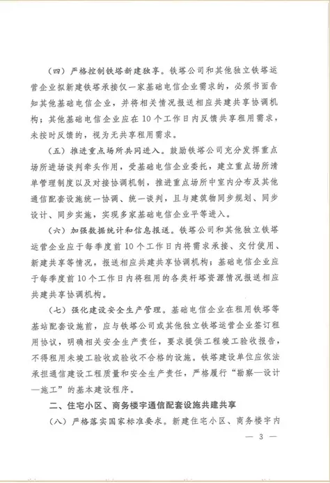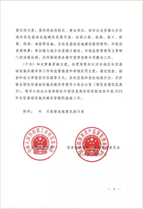近日,《工業(yè)和信息化部》與《國務(wù)院國有資產(chǎn)監(jiān)督管理委員會》聯(lián)合發(fā)文《關(guān)于2019年推進(jìn)電信基礎(chǔ)設(shè)施共建共享的實施意見》(工信部聯(lián)通函(2019)123號),文件針對:全省、自治州、直轄市通信管理局、中國電信集團(tuán)有限公司、中國移動通信集團(tuán)有限公司、中國聯(lián)合網(wǎng)絡(luò)通信集團(tuán)有限公司、國家電網(wǎng)有限公司、中國南方電網(wǎng)有限責(zé)任公司、中國廣播網(wǎng)絡(luò)有限公司、中國鐵塔股份有限公司等涉及通訊業(yè)務(wù)的公司,文件提出:2019年,電信基礎(chǔ)設(shè)施共建共享工作將以持續(xù)提升資源共建共享水平、有力支撐行業(yè)高質(zhì)量發(fā)展為目標(biāo),強(qiáng)化統(tǒng)籌集約建設(shè)和存量資源共享,積極拓展跨行業(yè)共建共享范圍,保障通信基礎(chǔ)設(shè)施建設(shè)通行權(quán)和公平進(jìn)入,促進(jìn)行業(yè)減低增效。
