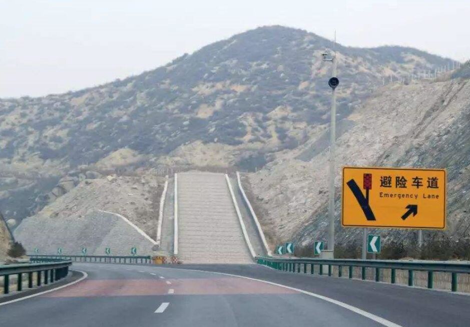 在長陡下坡路段,因車輛制動失效,而導致車輛失控,在行車道外側增設避險車道,供失控車輛駛離正線安全減速,規避事故危險。